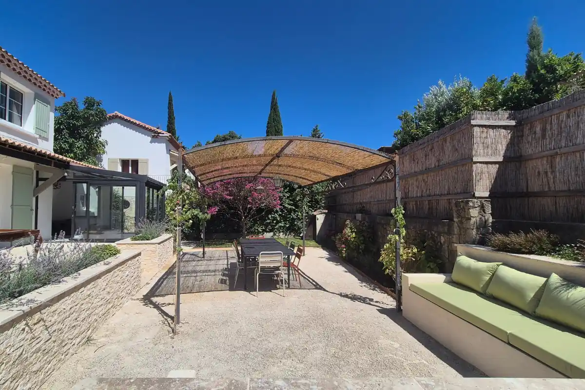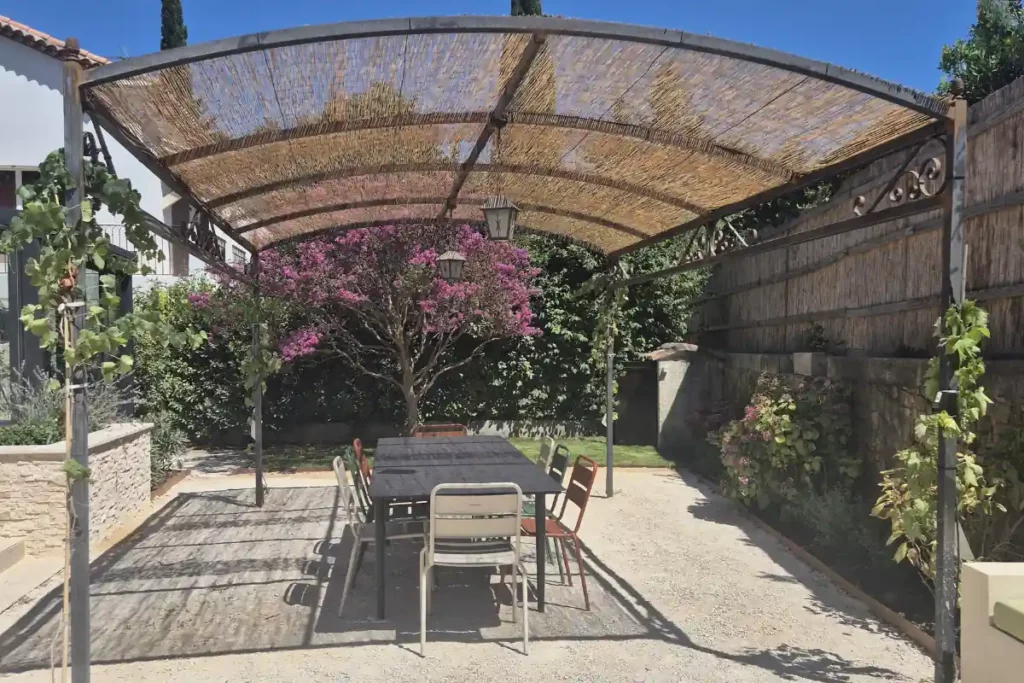 Une pergola en fer forgé vient structurer l’espace tout en apportant du caractère à l’ensemble. Elle abrite un coin repas convivial, idéal pour partager des moments autour d’une table lors des beaux jours.