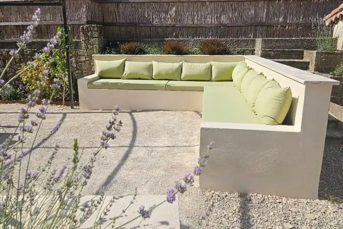 Dans le prolongement de la terrasse, nous avons également créé un espace salon extérieur, avec une banquette sur mesure intégrée à l’existant. Conçue pour offrir un confort optimal, elle renforce l’identité de la maison tout en créant un lieu chaleureux dédié à la détente.