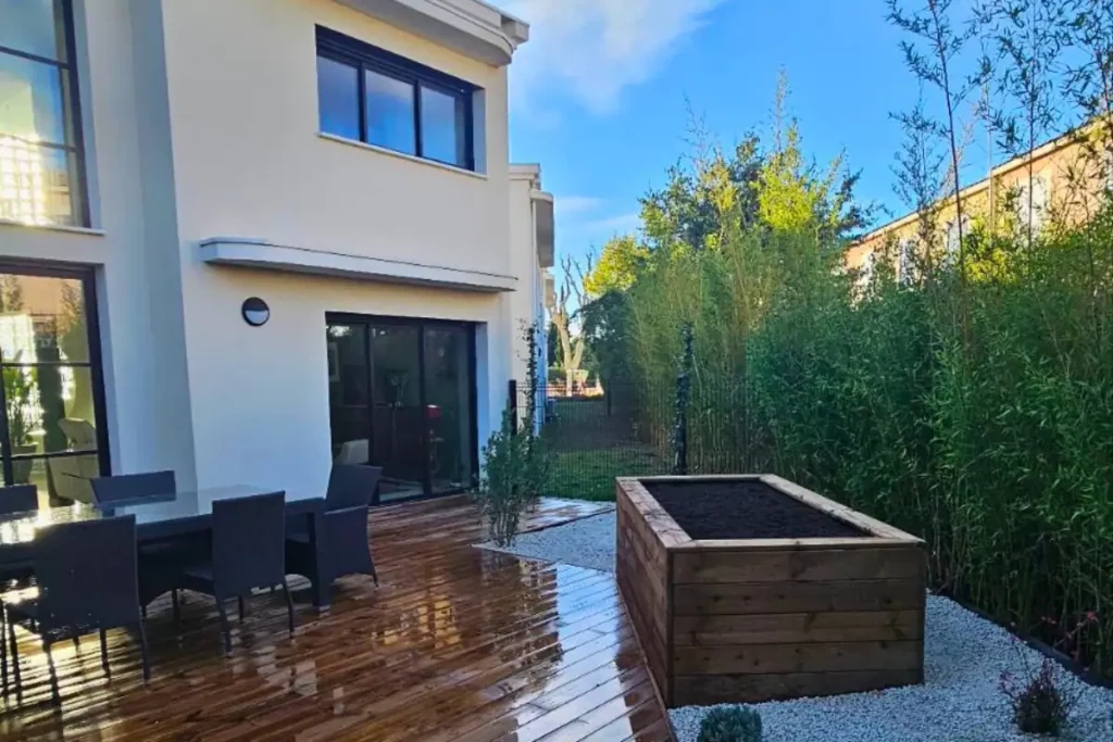 Nous avons imaginé un aménagement complet de jardin, mêlant terrasse en bois, allée structurante et zones végétalisées afin d’organiser les espaces et d’apporter du confort au quotidien.